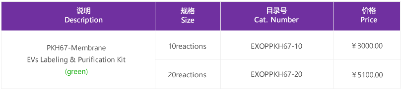 Extracellular vesicles (EVs) are membrane-derived particles surrounded by a phospholipid bilayer that are released by cells. We use PKH67 dye to efficiently label EV membranes. Then the excess unbound dyes are fast removed through our excellent Spin Columns from labeled exosome preparations, which separate molecules on the basis of the differences in size. Contaminant removal is easier and faster than traditional clean-up methods such as ultracentrifugation, spin filters.