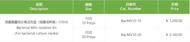 此試劑盒有不同規(guī)格,一次可處理10ml或40ml細菌培養(yǎng)基,操作簡單,適合常規(guī)實驗室的囊泡研究,分離的MVs可用于粒徑分析,核酸提取,Western Blot等。