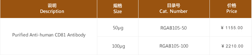 CD81 is a 26 kD non-glycosylated member of the tetraspanin superfamily (TM4SF). CD81 is expressed on T and B cells, NK cells, monocytes, dendritic cells, thymocytes, endothelial cells, and fibroblasts. It also has low levels of expression on granulocytes. CD81 induces B cell adhesion via VLA-4 integrin and has been shown to play a role in early T cell development. CD81 associates with several other cell-surface proteins in a multimolecular complex, including CD19, CD21, CD20, CD37, CD53, and CD82 in B cells, and CD4, CD8, and CD82 in T cells. CD81 is frequently expressed on exosome membranes used to characterize exosome populations from a variety of body fluids.