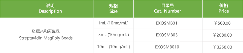 Streptavidin MagPoly beads are ideal for purification of biotinylated proteins and nucleic acids, here is primarily intended for isolation of human exosome subpopulations and flow cytometry analysis from cell culture media or urine. This product can be also used to prepare exosome subpopulations for western blot, electron microscopy and qRT-PCR etc.. Streptavidin MagPoly beads are uniform, superparamagnetic polystyrene beads (1.0um diameter) coated with streptavidin. The beads need to be coated with your exosome specific antibody (biotinylated) prior to use. The antibody coupled beads are directly incubated with samples and captured exosomes are magnetically separated for downstream applications.