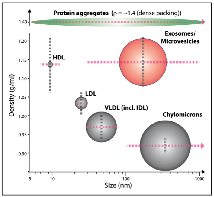 ▲細(xì)胞外囊泡與脂蛋白的體積、密度比較圖